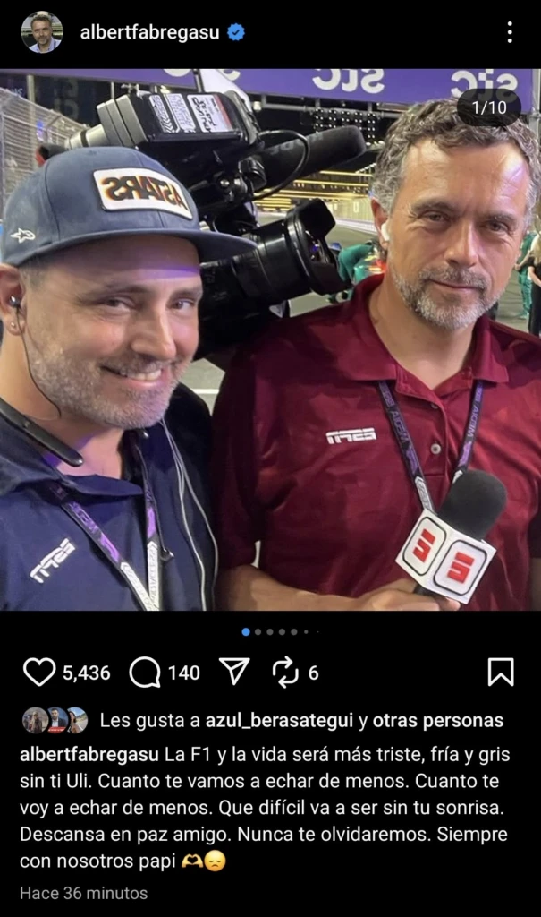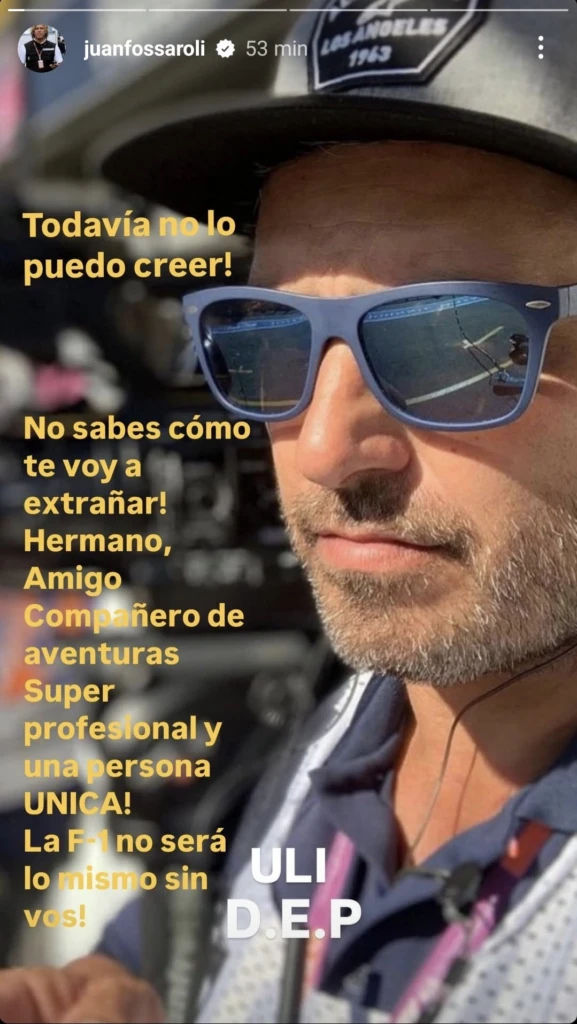 Otro que se mostró muy dolido por su muerte es Juan Fossaroli, quien era allegado a Ulises. “Todavía no lo puedo creer. No sabes cómo te voy a extrañar. Hermano, amigo, compañero de aventuras. Súper profesional y una persona ÚNICA. La F1 ni será lo mismo sin vos. ULI D.E.P", expuso.