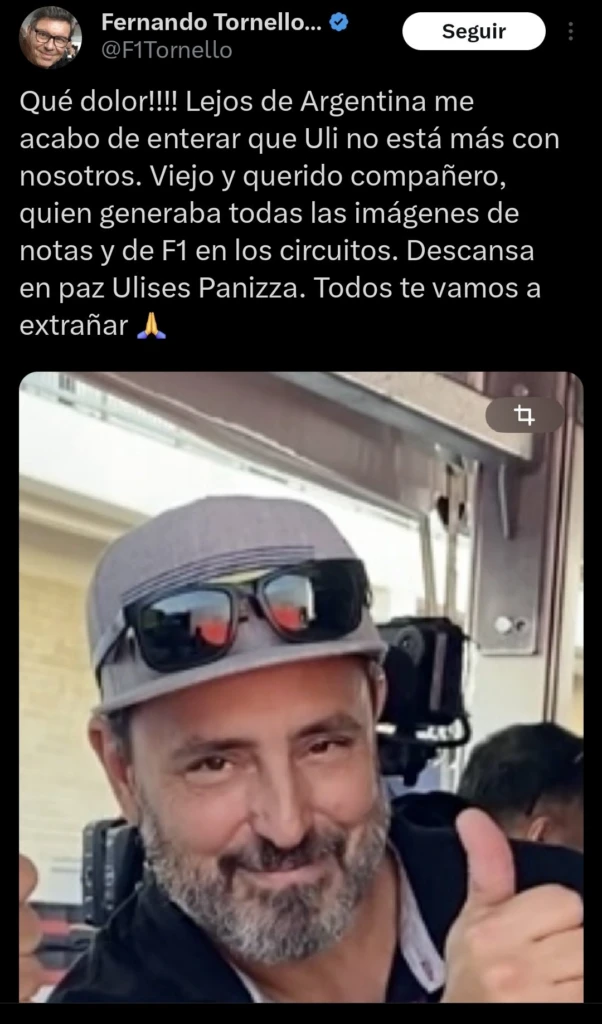Fernando Tornello, periodista especializado en la F1, le dedicó sentidas palabras: “Qué dolor. Lejos de Argentina me acabo de enterar que Uli no está más con nosotros. Viejo y querido compañero, quién generaba todas las imágenes de notas y de F1. Descansa en paz Ulises Panizza. Todos te vamos a extrañar”.