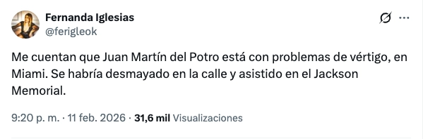 Según información que dio a conocer Fernanda Iglesias a través de sus redes sociales, Del Potro estaría sufriendo episodios de vértigo. En su cuenta de X, dio detalles: "Me cuentan que Juan Martín del Potro está con problemas de vértigo, en Miami. Se habría desmayado en la calle y asistido en el Jackson Memorial".
