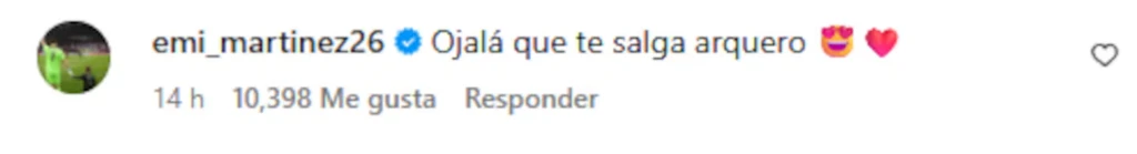 “Ojalá te salga arquero”, escribió. Por supuesto que el comentario comenzó a viralizarse en las redes sociales donde todos aplaudieron el sentido del humor del Dibu. A diferencia del resto de sus compañeros, el arquero hizo reír a más de uno.