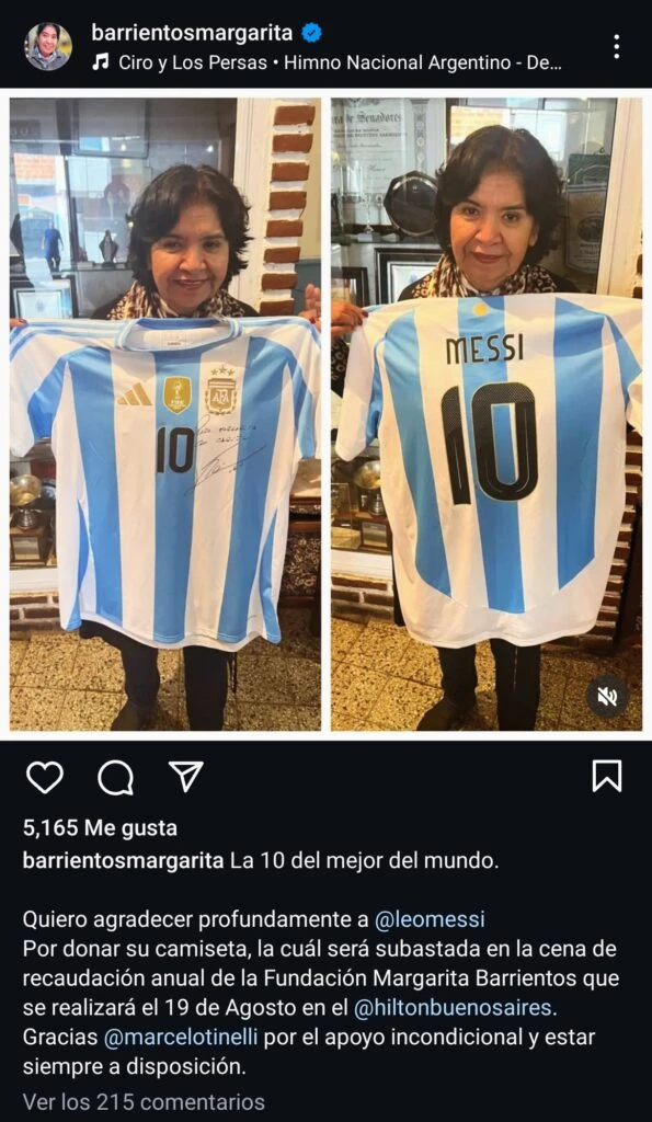 “La 10 del mejor del mundo. Quiero agradecer profundamente a Leo Messi por donar su camiseta, la cual será subastada en la cena de recaudación anual de la Fundación Margarita Barrientos que se realizará el 19 de agosto en el Hotel Hilton de Buenos Aires. Gracias Marcelo Tinelli por el apoyo incondicional y estar siempre a disposición”, sostuvo Margarita sobre Lionel.