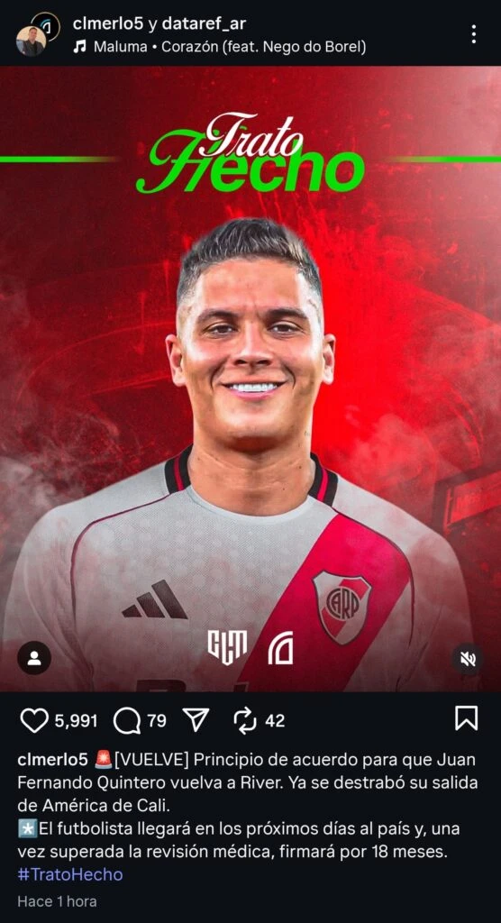Con esta incorporación, River suma a Quintero a las caras nuevas que ya integran Maxi Salas y Lautaro Rivero. Además, la dirigencia mantiene negociaciones por otros posibles refuerzos como Juan Carlos Portillo, Lucas Cepeda y Matías Galarza Fonda, en busca de completar el plantel.