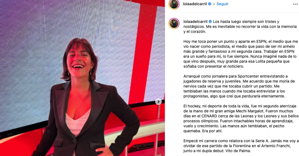 La periodista deportiva y relatora anunció mediante su cuenta de Instagram su partida del canal líder en deportes. A través de un posteo extenso, Lola, quien se convirtió en una referente junto a otras comunicadoras, cerró su etapa.