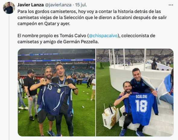 En su cuenta de Twitter, el periodista Javier Lanza escribió "Para los gordos camiseteros, hoy voy a contar la historia detrás de las camisetas viejas de la Selección que le dieron a Scaloni después de salir campeón en Qatar y ayer. El nombre propio es Tomás Calvo (@chispacalvo), coleccionista de camisetas y amigo de Germán Pezzella".