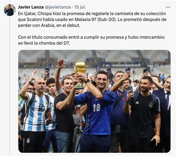 "En Qatar, Chispa hizo la promesa de regalarle la camiseta de su colección que Scaloni había usado en Malasia 97 (Sub-20). Lo prometió después de perder con Arabia, en el debut. Con el título consumado entró a cumplir su promesa y hubo intercambio: se llevó la chomba del DT" siguió Lanza.