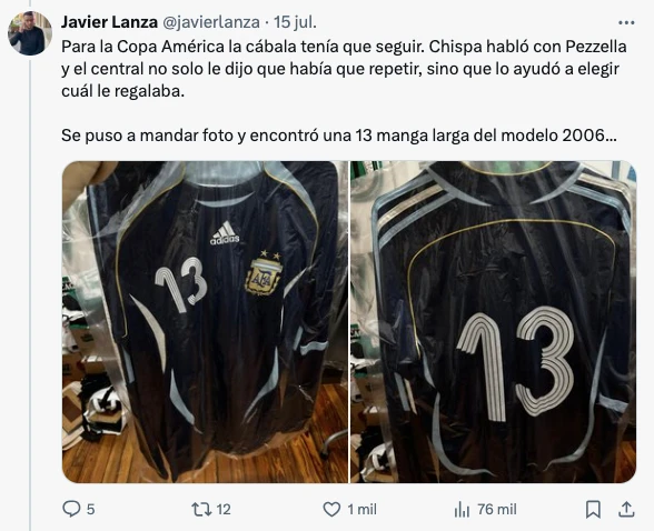 "Para la Copa América la cábala tenía que seguir. Chispa habló con Pezzella y el central no solo le dijo que había que repetir, sino que lo ayudó a elegir cuál le regalaba. Se puso a mandar foto y encontró una 13 manga larga del modelo 2006...Cuando Tomás supo que esa camiseta 13 la había usado Lionel Scaloni no dudó un segundo y le dijo a Germán: "Vamos a salir campeones de nuevo". La había comprado en un lote en 2010 y nunca había averiguado de quien era. ¿Casualidades? Para mí no existen. ¿O no, Tomi?" cerró el periodista. ¿Ya sabemos lo que hay que hacer si se juega la Finalíssima contra España y en el próximo mundial, no?