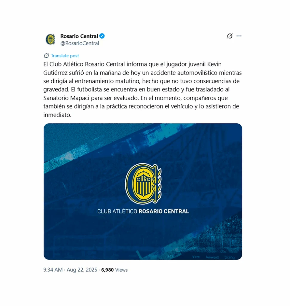 “El Club Atlético Rosario Central informa que el jugador juvenil Kevin Gutiérrez sufrió en la mañana de hoy un accidente automovilístico mientras se dirigía al entrenamiento matutino, hecho que no tuvo consecuencias de gravedad”, comentaron.