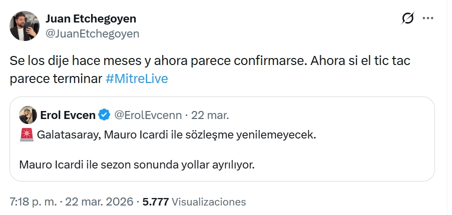 Así lo informaron desde Turquía, luego de meses de rumores de su inminente salida, cuando el contrato expire en junio. “Se los dije hace meses y ahora parece confirmarse. Ahora si el tic tac parece terminar”, anunció Juan Etcheyoyen en redes, al compartir el tweet de un periodista turco.