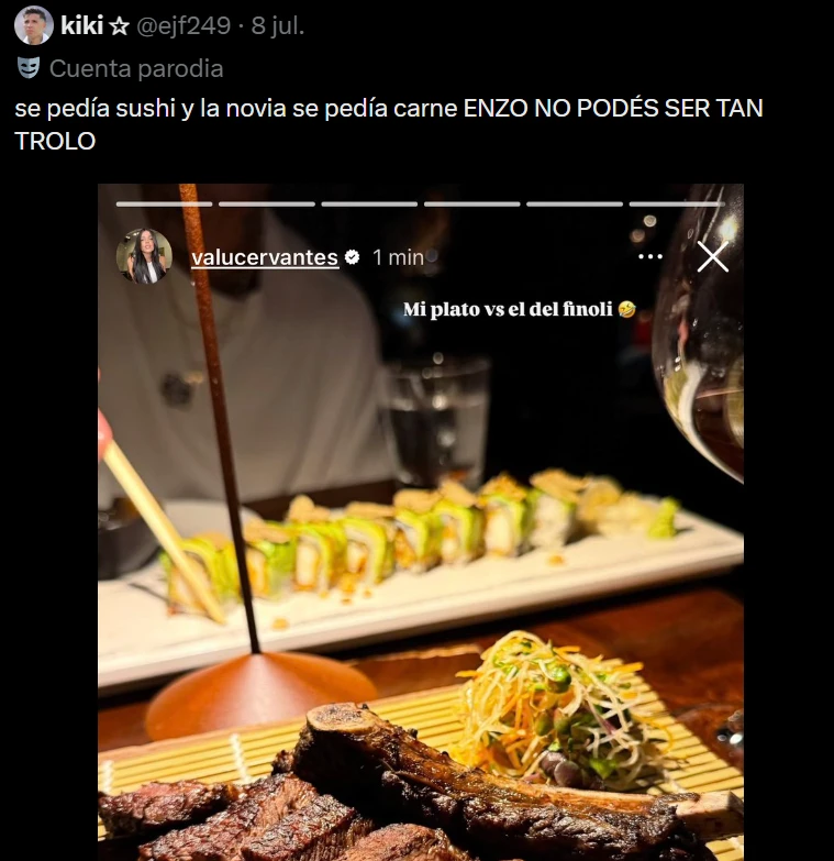 Valentina Cervantes compartió una imagen de su cena con Enzo Fernández y las redes no se lo perdonaron al jugador de fútbol. La influencer mostró qué pidió cada uno y eso terminó en burlas. Ella comió carne. Él eligió sushi: “Mi plato versus el del finoli”.
