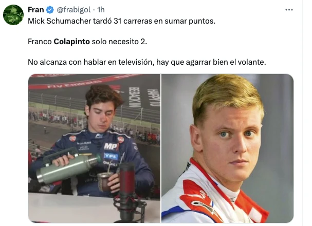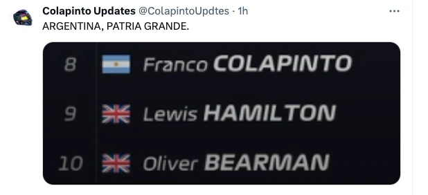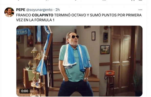 Pero como siempre que hay un evento de esta envergadura, en X suelen aparecer muchísimos memes y que se hacen virales en cuestión de segundos. Y claro que esta vez no fue la excepción y Colapinto desató risas en muchos usuarios.