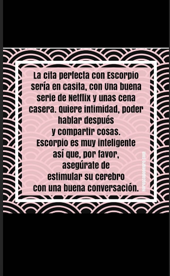 “La cita perfecta con escorpio sería en casita, con una buena serie de Netflix y una cena casera. Quiere intimidad, poder hablar después y compartir cosas. Escorpio es muy inteligente, así qué, por favor, asegúrate de estimular su cerebro con una buena conversación”, sostuvo Neumann.