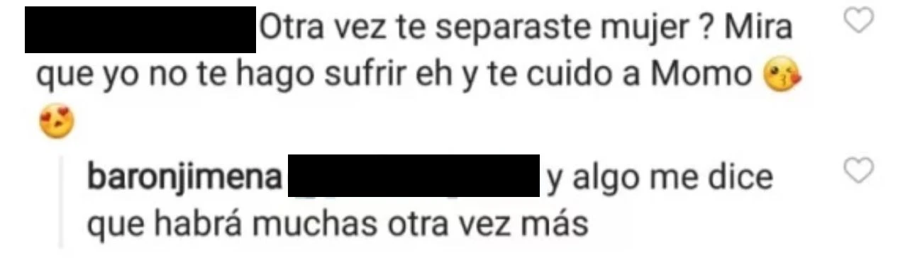 "¿Otra vez te separaste, mujer? Mirá que yo no te hago sufrir, eh. Y te cuido a Momo", escribió su fan y Jimena le respondió "Y algo me dice que habrá muchas otra vez más", mostrando su desilusión con las relaciones de pareja.