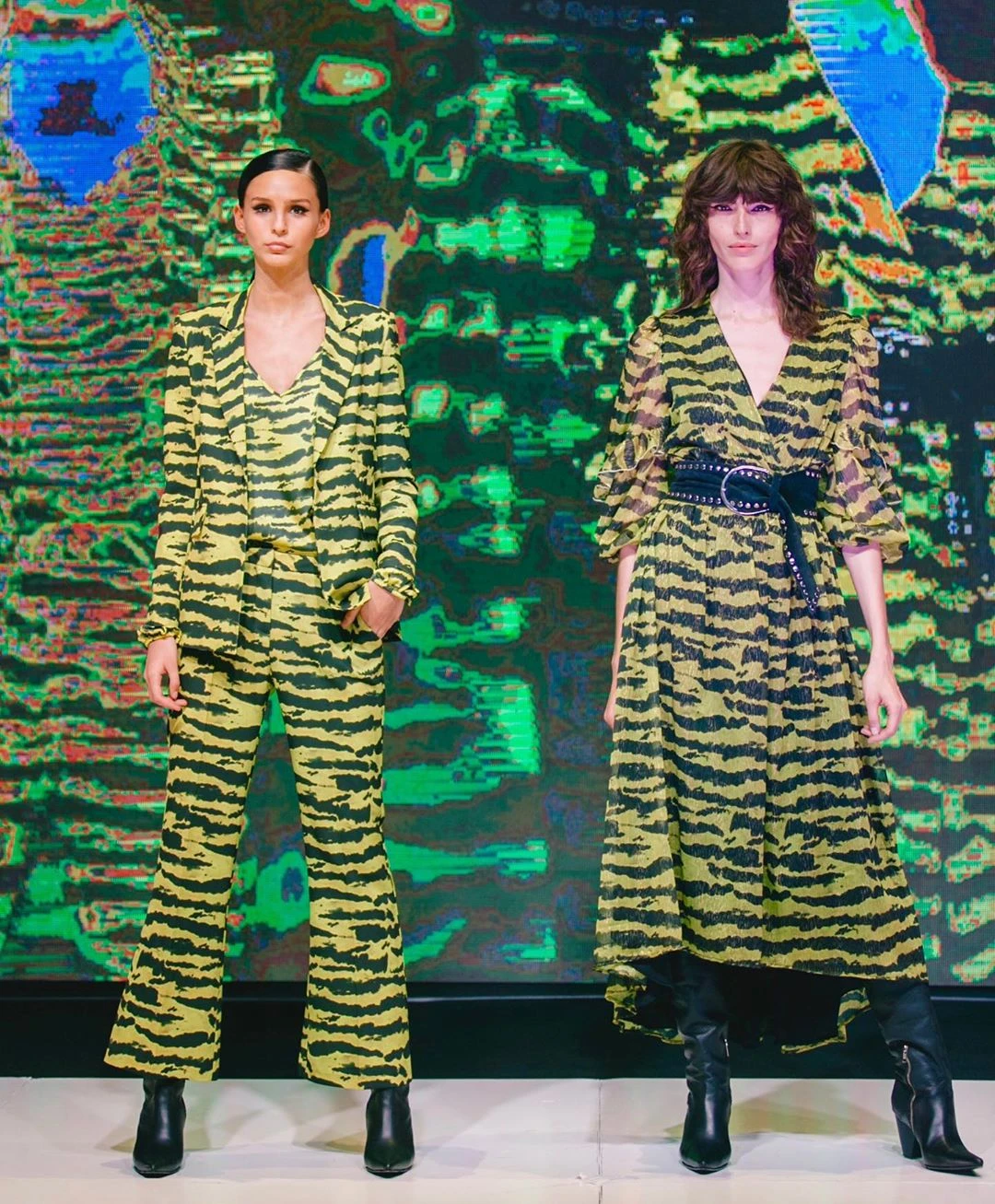 Juanita desfiló tres veces y presentó atuendos diferentes. En su primera pasada lució un traje animal print color negro y verde lima. Su segundo vestuario fue de un vestido de brillos en la gama de los grises, azules y blancos, y con unas botas texanas. Por último, un short con una remera acompañado por un tapado de color fucsia.