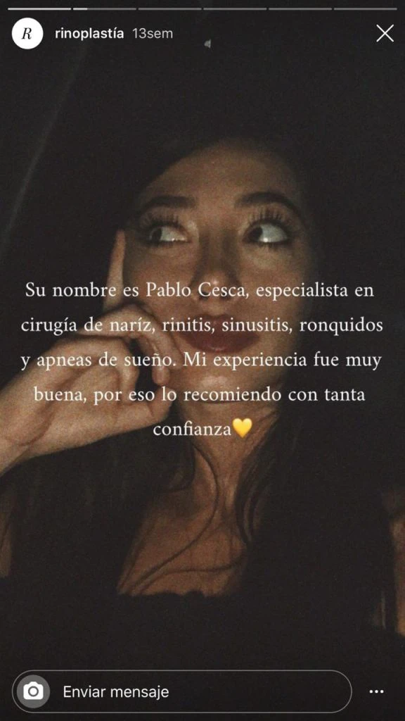 “Su nombre es Pablo Cesca, especialista en cirugía de nariz, rinitis, sinusitis, ronquidos y apnea de sueño. Mi experiencia fue muy buena, por eso lo recomiendo con tanta confianza”, expresó la joven