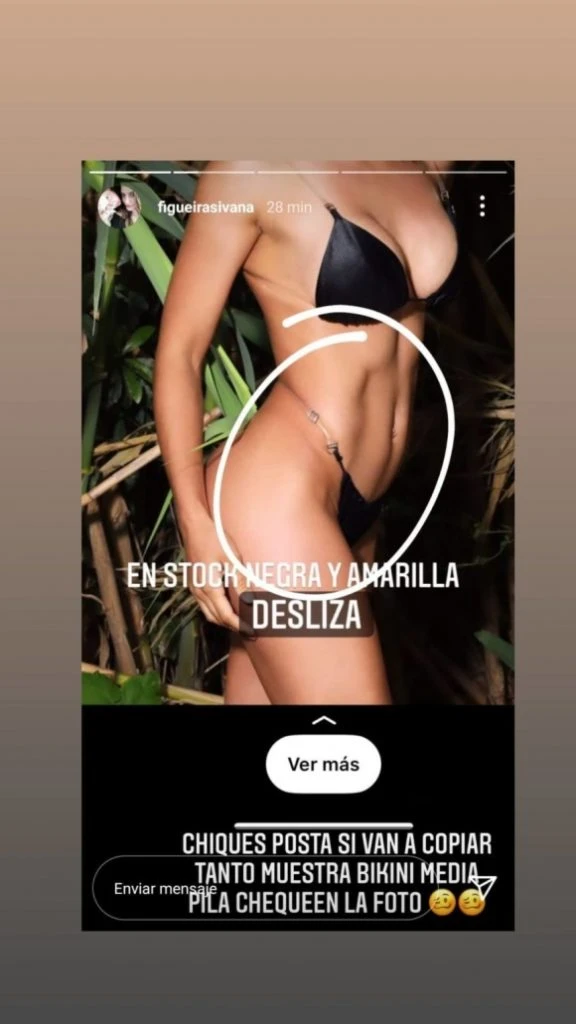 Indignada ante la posibilidad de que se haya usado su prenda para promocionar otra marca, también por redes sociales, replicó la foto y le agregó un picante mensaje. “Chiques posta, si van a copiar tanto nuestra bikini media pila…chequeen foto”, ironizó Figueiras, detallando que no estaba bien hecho el estilismo.