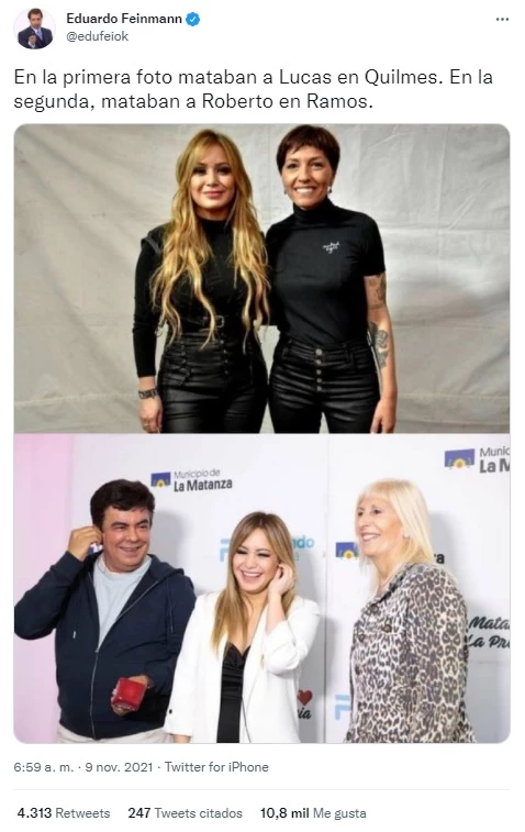 A través de su cuenta de Twitter, el periodista apuntó contra el funcionario y también contra Mayra Mendoza, intendenta de Quilmes, por mostrarse junto a la cantante como propaganda política. "En la primera foto mataban a Lucas en Quilmes. En la segunda, mataban a Roberto en Ramos", escribió duramente Feinmann en su posteo.
