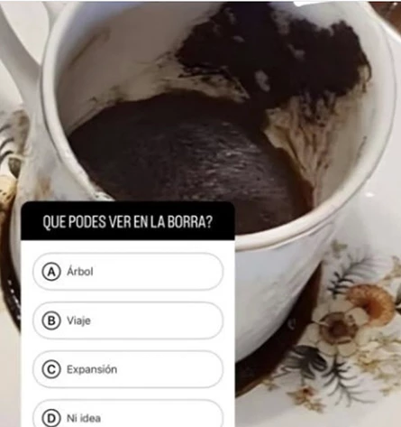 "¿Qué podés ver en la borra?”, preguntó Neumann, junto a la foto de la consumición. “Árbol, viaje, expansión, ni idea”, planteó como opciones, para que la gente elija. A simple vista, lo que se observa es un árbol frondoso. Para los entendidos en la materia, esto significaría búsqueda de protección y, también, nuevos amigos y oportunidades en el camino de la vida.