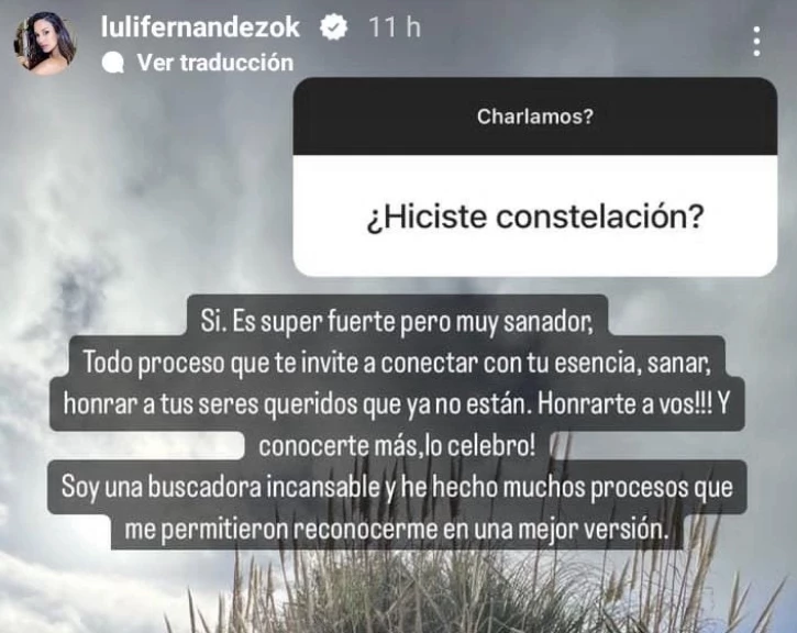 "¿Hiciste constelación", le consultó un seguidor a la propuesta a Luli bajo la consigna "¿charlamos?". "Sí. Es súper fuerte, pero muy sanador", se sinceró la ex integrante de Socios del espectáculo, el programa de El 13, quien ahora está en un receso laboral mientras aparece la posibilidad de concretar su deseo: conducir un ciclo.
