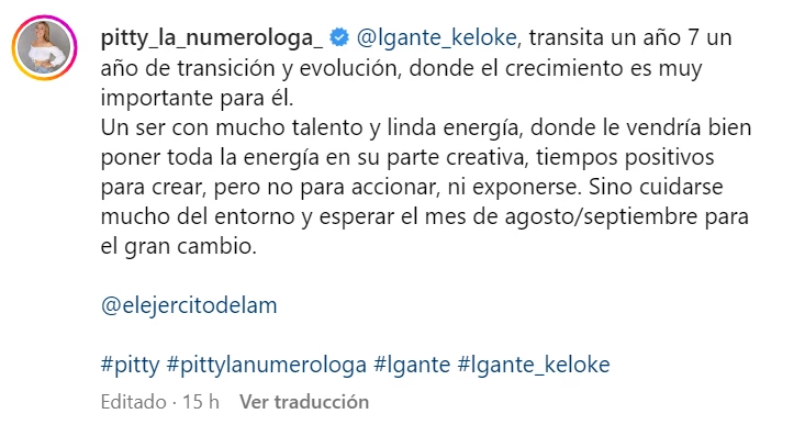 “Es un año de transición y evolución, donde el crecimiento es muy importante para él”, completó luego en su posteo, donde sumó: “Es un ser con mucho talento y le vendría bien poner toda la energía en su parte creativa, son tiempos positivos para crear pero no para accionar ni exponerse”.