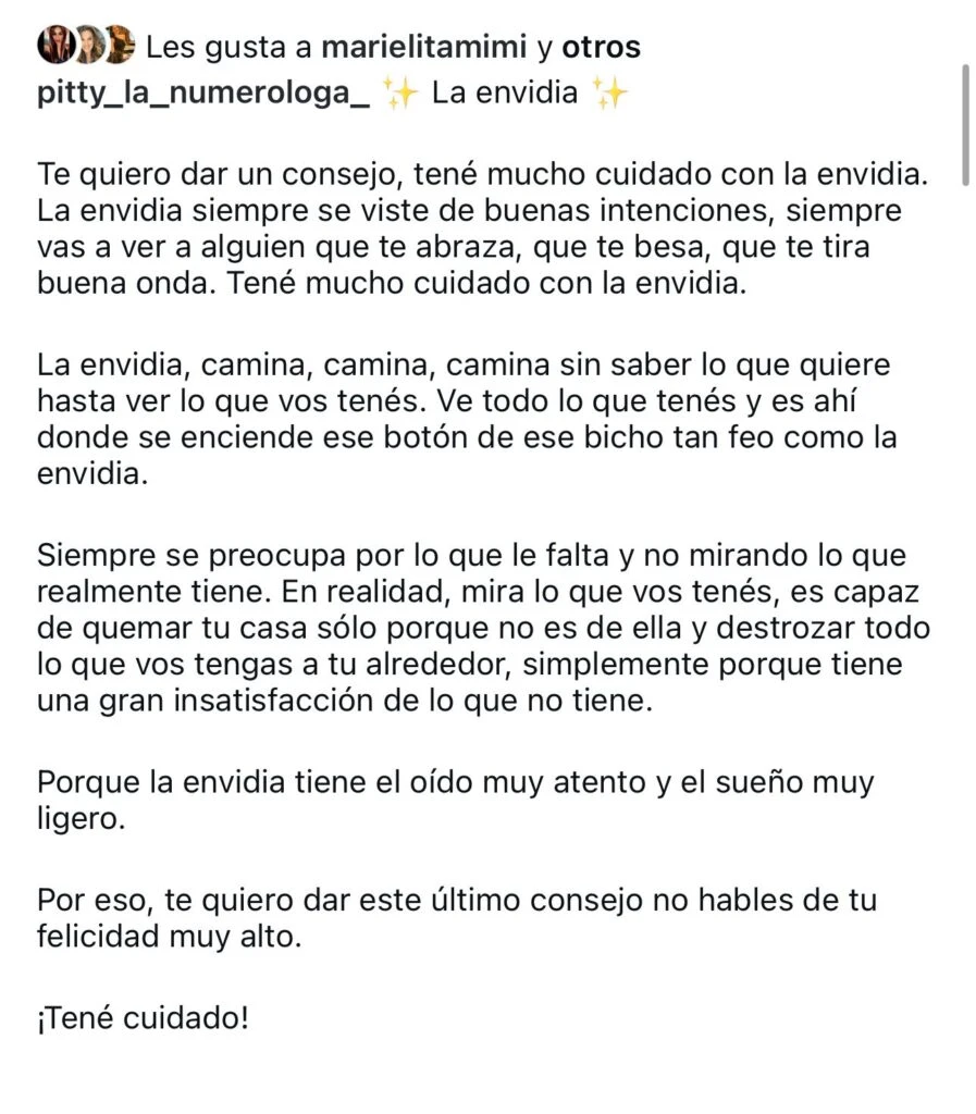 “Ve todo lo que tenés y es ahí donde se enciende ese botón de ese bicho tan feo como la envidia. Siempre se preocupa por lo que le falta y no mirando lo que realmente tiene. En realidad, mira lo que vos tenés, es capaz de quemar tu casa sólo porque no es de ella y destrozar todo lo que vos tengas a tu alrededor, simplemente porque tiene una gran insatisfacción de lo que no tiene”, sumó la famosa Numeróloga.
