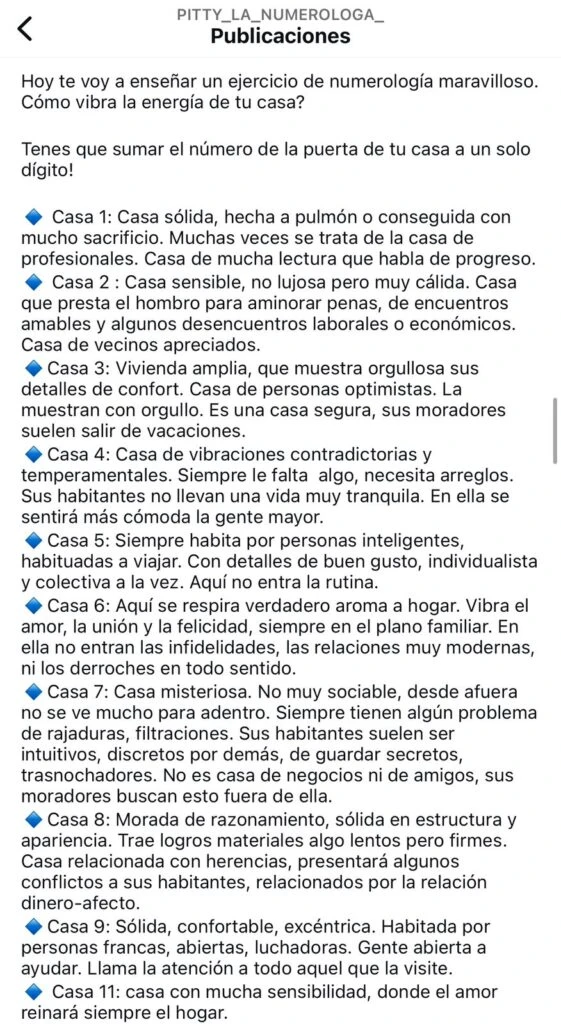 Siguiendo con la descripción, La Numeróloga amplió: “Casa 5: Siempre habita por personas inteligentes, habituadas a viajar. Con detalles de buen gusto, individualista y colectiva a la vez. Aquí no entra la rutina. Casa 6: Aquí se respira verdadero aroma a hogar. Vibra el amor, la unión y la felicidad, siempre en el plano familiar. En ella no entran las infidelidades, las relaciones muy modernas, ni los derroches en todo sentido”.