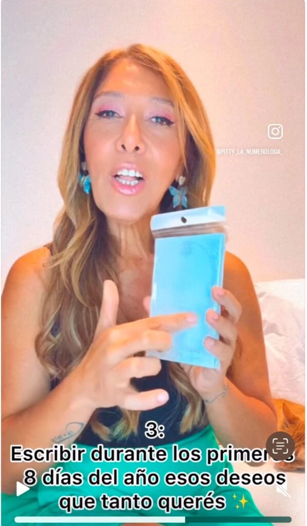 “Te voy a enseñar unos tips para recibir el año con la mejor energía”, comenzó la especialista en futurología dirigiéndose a su gente y mirando a la lente del celular. A lo que siguió: “El 31 coloca en un cuenco con agua monedas y déjalas toda la noche”.