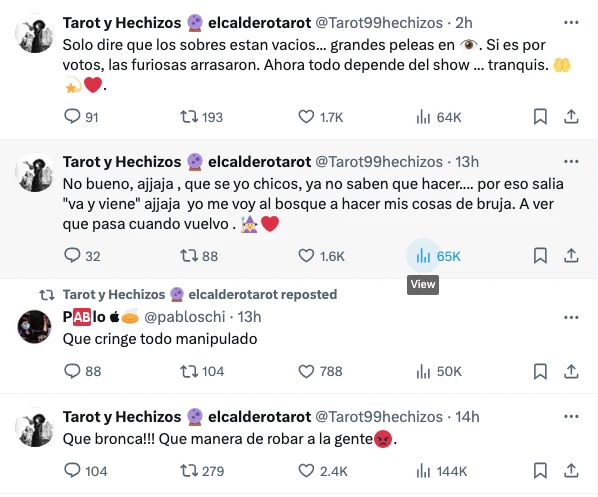 "Que cringe todo manipulado. y qué bronca, qué manera de robarle a la gente", definió también "Tarot 99 hechizos" a través de distintos posteos mostrándose molesta por la división de la gala de eliminación que se dividió en 2 partes y hasta hoy no se conocerá qué jugador abandona la casa.