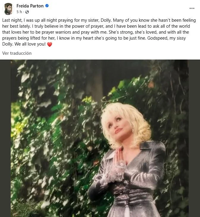 “Anoche estuve despierta toda la noche orando por mi hermana, Dolly. Muchos de ustedes saben que no se ha sentido muy bien últimamente”, escribió Freida en Facebook. Luego agregó: “Creo firmemente en el poder de la oración, y he recibido la inspiración para pedirles a todos los que la aman que sean guerreros de oración y oren conmigo por ella”.