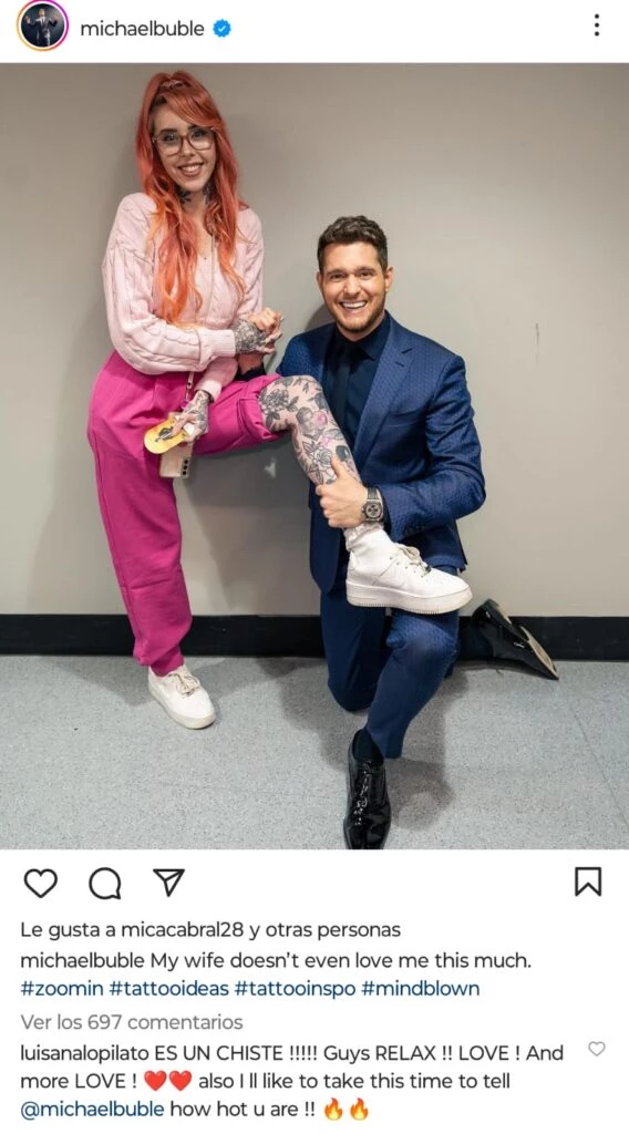 Michael Bublé se encuentra en medio de una controversia después de realizar una publicación peculiar. Mientras está de gira de conciertos, el cantante y esposo de Luisana Lopilato tuvo la oportunidad de conocer a una de sus fanáticas, quien lleva tatuado el rostro de Bublé en una de sus piernas.