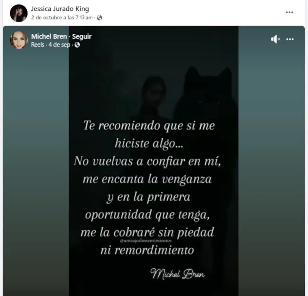 Días antes de que muriera, Jessica se expresó en redes sociales y publicó un extraño mensaje sobre la venganza. “Te recomiendo que si me hiciste algo no vuelvas a confiar en mi. Me encanta la venganza y en la primera oportunidad que tenga me la cobraré sin piedad ni remordimiento”, sostuvo.