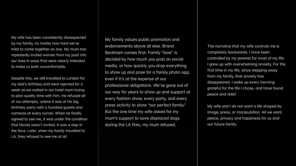 A través de un extenso descargo publicado en sus redes sociales, Brooklyn apuntó directamente contra sus padres, David y Victoria Beckham, y explicó por qué no tiene intenciones de reconciliarse. “He guardado silencio durante años e hice todo lo posible por mantener estos asuntos en privado. Pero mis padres y su equipo siguieron recurriendo a la prensa, lo que me obligó a hablar y decir la verdad”, escribió.