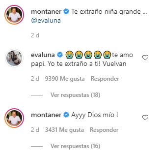 La joven no tardó en contestar: "Te amo papi. Yo te extraño a ti. Vuelvan", escribió la actriz junto a emoticones de tristeza. El cantante volvió a responder: "Ay, Dios mio", haciendo referencia a lo mal que la está pasando.