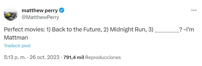 Otro detalle que llamó la atención sobre esto, fue el último tuit que escribió. El pasado 26 de octubre comentó cuáles eran sus tres películas favoritas y también tuvo muchísimas impresiones: “Perfect movies: 1) Back to the Future (Volver al futuro), 2) Midnight Run (Fuga a la medianoche), 3) _________? -I’m Mattman”.