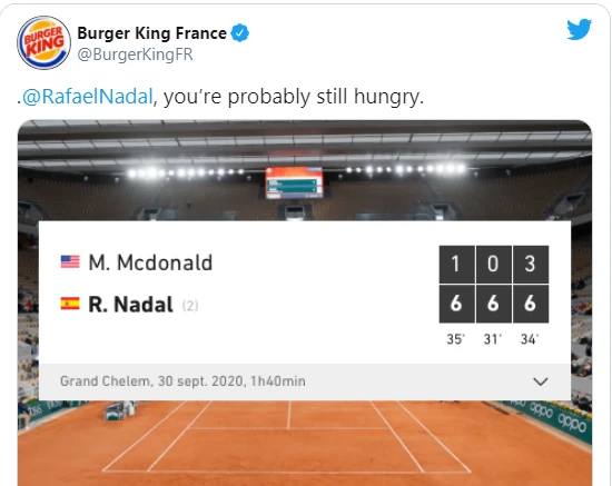 Este resultado fue aprovechado por Burger King para bromear Mc Donald´s y se convirtió en toda una sensación en las redes: "@RafaelNadal probablemente sigas hambriento" posteó @BurgerKingFR.