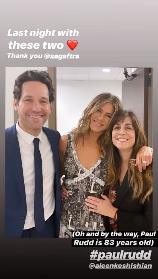 Jen Anniston, la recién llegada a Instagram (de también 50 años), no dejó pasar la oportunidad para bromear al respecto, y compartió una imagen en sus historias donde escribió “Anoche con estos dos. Gracias @sagaftra“, la estrella de ‘The Morning Show’ añadió “Y por cierto, Paul Rudd tiene 83 años de edad“. Demostrando una vez más que ser nueva en la red social no implica que no la maneje a la perfección.