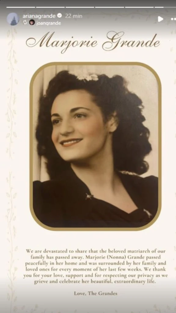 “Estamos devastados de compartir que la querida matriarca de nuestra familia ha fallecido. Marjorie (Nonna) Grande falleció pacíficamente en su hogar y estuvo rodeada de su familia y seres queridos durante cada momento de sus últimas semanas", se lee.