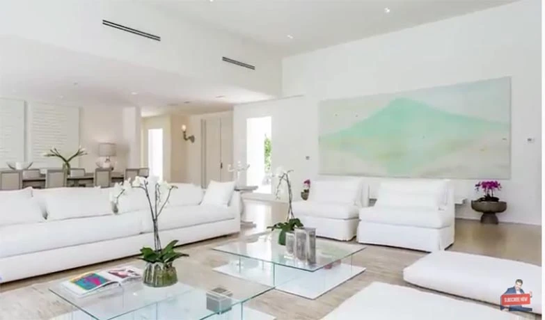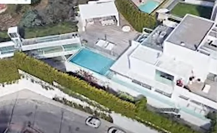La casa cuenta con tres plantas de altura y dos subterráneas donde se se encuentran la bodega y el garaje. Cuenta con amplias terrazas en casa una de las habitaciones, salones para conferencias, un cine, un gimnasio, un amplio jardín y una piscina alargada estilo cascada. Además, hay una pista de tenis, un deporte que ambos practican y les apasiona.