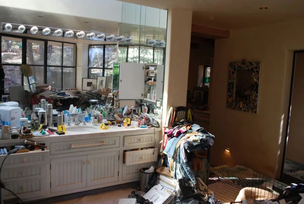 Las fotos permiten ver el desorden y acumulación en la que vivía la pareja en cada uno de los ambientes por donde el actor de Hollywood deambuló en soledad durante días, aquejado de Mal de Alzheimer, perdido tras la muerte de su mujer, hasta morir postrado en un sillón.