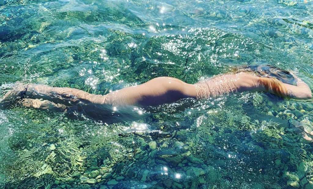 “Underwater mood, good life (Modo bajo el agua, buena vida)”, escribió pícara al pie de una fotografía en que se la ve nadando completamente desnuda. “Los días en Ibiza”, dejó asentado en otra foto en se la ve de espaldas, luciendo una microbikini negra y sosteniendo sus lolas con sus manos. ¡Diosa!