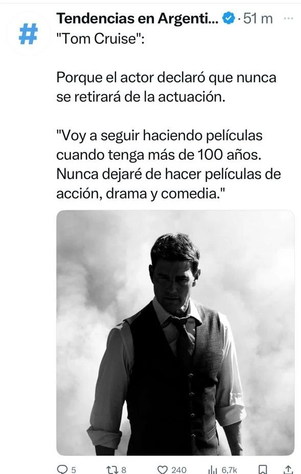 En el contexto de ese evento el eterno galán de Hollywood siguió haciendo hincapié a esa decisión sobre su carrera y fue de ello que se habló en la red de Twitter donde fue tendencia. Pero si bien Tom aseguró que desea continuar actuando por mucho tiempo más ya no será en el rol de protagonista de Misión Imposible.