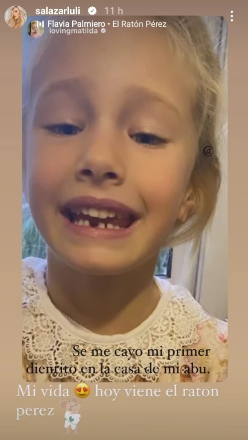 “Se me cayó mi primer diente en la casa de mi abu. Mi vida, esta noche viene el Ratón Pérez”, compartió Luciana en sus historias, al publicar una foto de la nena luciendo con una sonrisa orgullosa la “ventanita” para la cámara.
