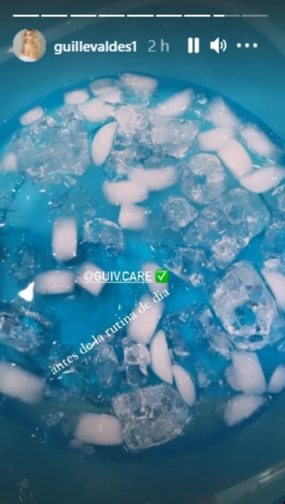 “Antes de la rutina de día”, escribió en una de sus historias de Instagram, junto a una foto donde se ve un recipiente con líquido ultra frío que se coloca en la cara cada vez que toma coraje, previo a las cremas ultra top de su línea de cosmética.