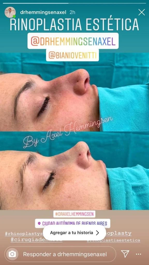 El jueves 21, la modelo Bianca Iovenitti, pasó por el quirófano para retocarse la nariz. Fue una operación sencilla que se la realizó el doctor Axel Hemmingsen y duró tan solo dos horas. “Fue algo sencillo, me hice una rinoplastia. Yo me venía poniendo hialurónico cuando iba a la tele o cuando me convocaban para una producción y bueno, con este paso voy a dejar de pincharme para ponerme eso, que es una boludez, pero molestaba”, le contó en exclusiva a Paparazzi.