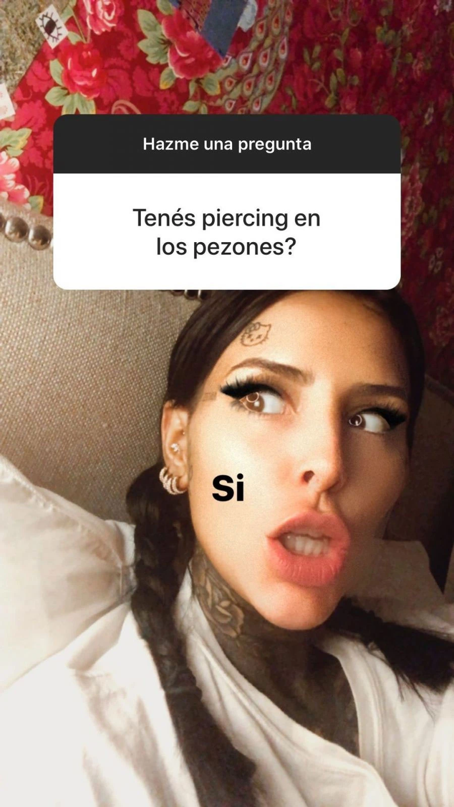 Atento a su estética transgresora, uno de sus admiradores le preguntó: “¿Tenés piercing en los pezones?”. A lo que Cande respondió con una divertida selfie con cara de sorpresa a la que le agregó la palabra “sí” en una de sus mejillas.
