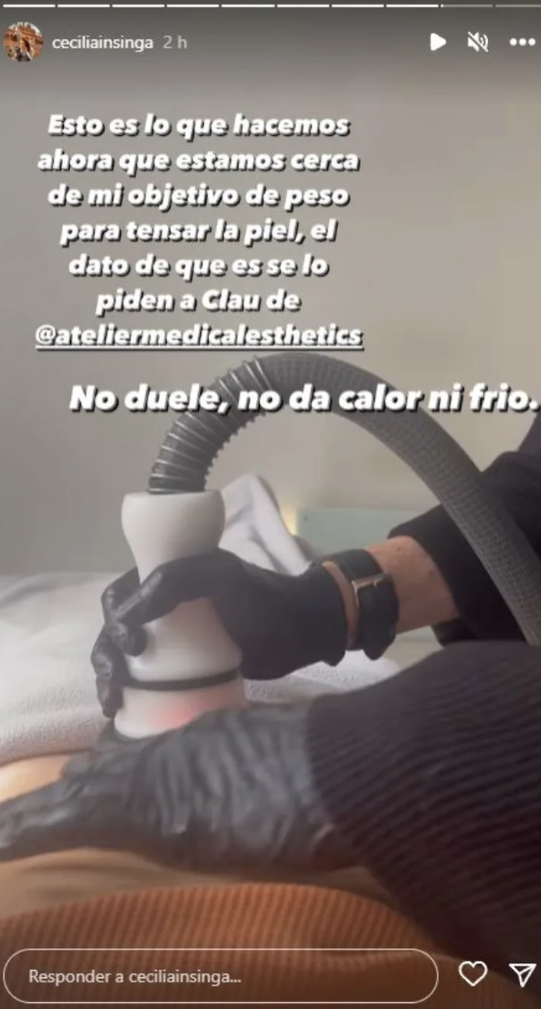 "Esto es lo que hacemos ahora que estamos cerca de mi objetivo de peso para tensar la piel... No duele, no da calor ni frío", explicó la movilera, ya que al iniciar el proceso para adelgazar la piel que se estiró previamente necesita ayuda para reposicionarla.