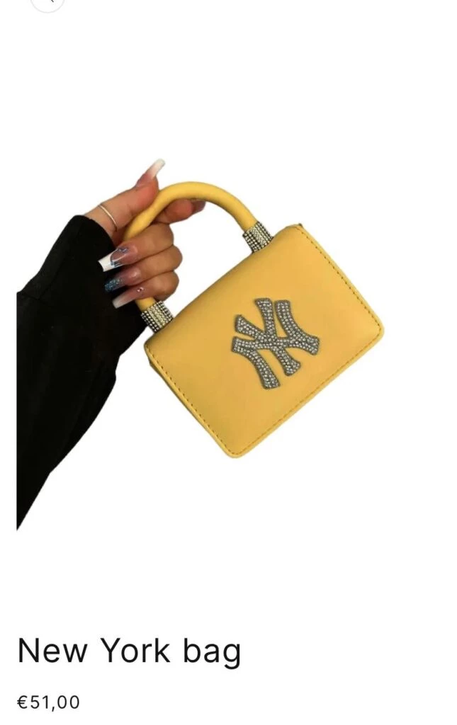 Ese producto tan pequeño con el que posó Mica fue el protagonista del total look. El accesorio en cuestión era una handbag color amarilla con detalles en strass tanto en el frente como en las tiras de la marca internacional NY, esa que comúnmente se ve en las caps con el logo.