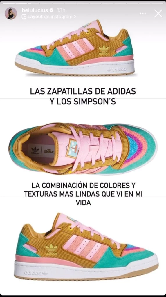 En la historia siguiente, la influencer mostró el par de calzado que tanto desea y cuyo valor por esta edición limitada de Adidas by Los Simpson estaría rondando los 2.400 dólares. “La textura más linda que vi en mi vida”, remató Belu.