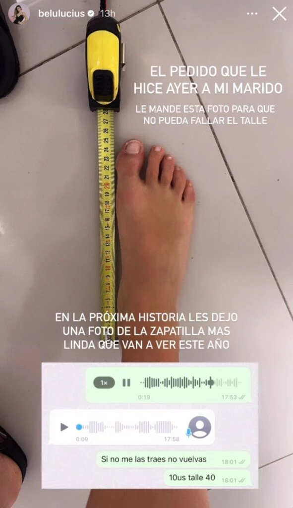 “No me interesa. Vos no volvés sin traerme esas zapatillas. ¿Sabes? Cambio y fuera”, remató Lucius en el mensaje de voz que le mandó a su esposo y donde, incluso, le especificó cuál es su talle para que no falle en la medida de su pie que sería un 40 en Argentina y un 10 en Estados Unidos.