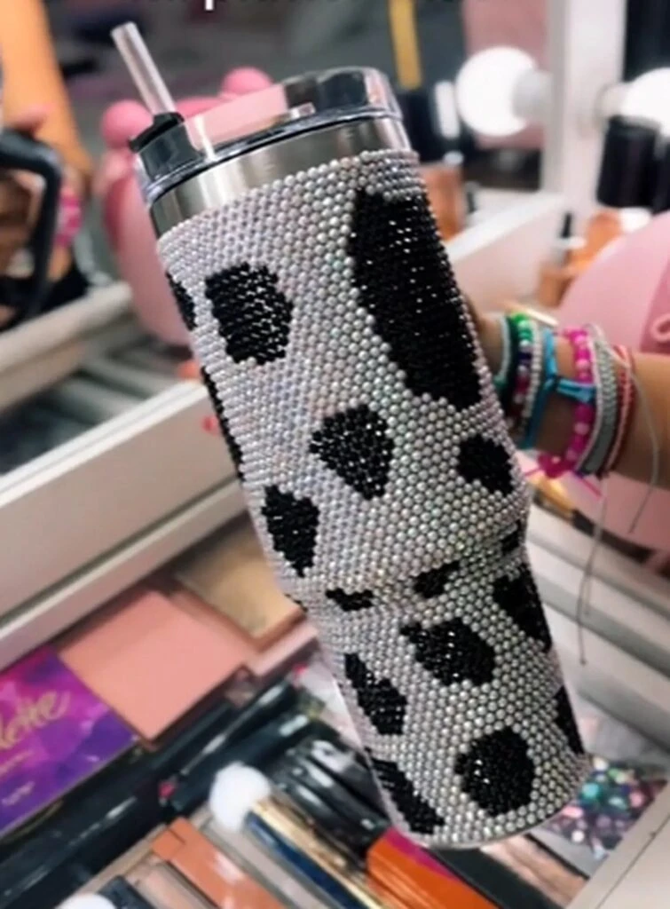 Entre los objetos mostrados se encontraban un vaso térmico con glitter blanco y negro, una botellita con glitter de color rosa, y varios artículos para el cuidado de las uñas y la piel. También, mostró un tacho de basura pequeño, un vaso con un sorbete metálico y “un vaso coquette”, según ella misma describió.