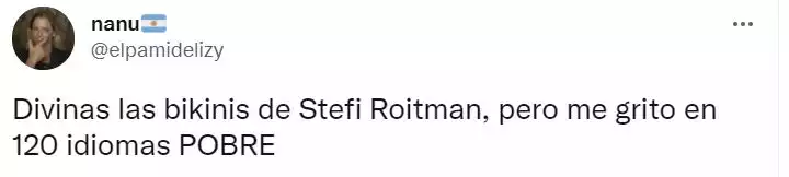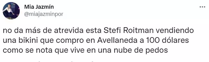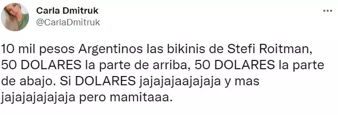 “Divinas las bikinis de Stefi Roitman, pero me gritó en 120 idiomas POBRE”; “10 mil pesos argentinos las bikinis de Stefi Roitman, 50 DÓLARES la parte de arriba, 50 DÓLARES la parte de abajo. Sí, ¡DÓLARES! jajajajaajajaja y más jajajajajajaja, pero mamitaaa”, fueron algunos de los comentarios en la red del pajarito.
